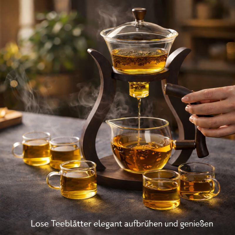 Die losen Teeblätter kommen oben hinein, das heiße Wasser entfaltet ihr volles Potenzial – und sobald das Tee perfekt gezogen ist, öffnest du den magnetischen Mechanismus. Der Tee fließt sauber in die untere Kanne. Kein Nachziehen, kein Bitterwerden, nur reiner Genuss.